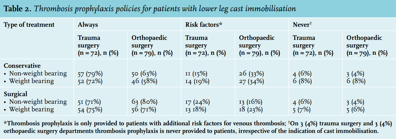 The effect of thrombosis prophylaxis on prevention of symptomatic venous thrombosis for two of the most commonly performed orthopaedic treatments world-wide (lower leg cast immobilisation and arthroscopy of the knee) is not well established.1-14 With this survey study we aim to provide insight into the thrombosis prophylaxis policies of orthopaedic and trauma surgeons, the relevant indications, and the considerations for providing such therapy.