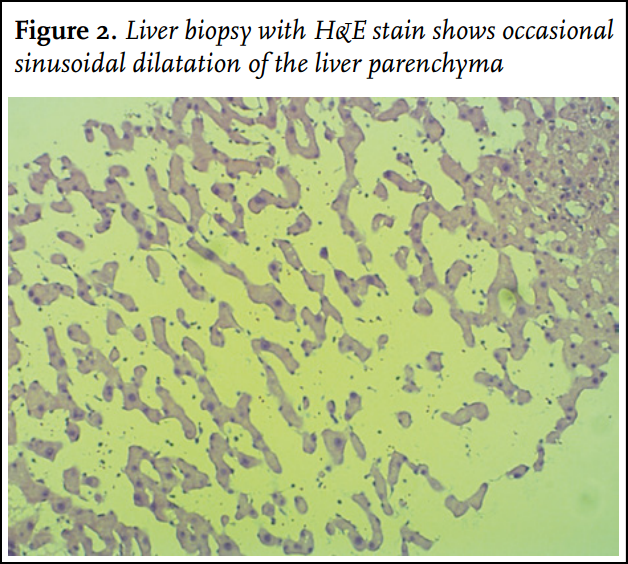 Both the epidemiology and natural history of peliosis hepatis are not completely understood. Most patients are asymptomatic and remain undiagnosed or have slowly progressive disease. Peliosis hepatis is often an incidental finding on abdominal imaging, as in our patient. On imaging studies, the differential diagnosis of peliosis hepatis includes other focal liver lesions including adenoma, haemangioma, focal nodular hyperplasia, abscess, hypervascular metastatic lesions, and hepatocellular carcinoma. On CT the lesions usually appear as heterogeneous densities that become hypodense in the late arterial and venous phase. On magnetic resonance imaging (MRI), peliosis hepatis lesions are typically of low signal intensity on T1-weighted images and of high signal on T2-weighted images, with late and slow but intense enhancement on contrast-enhanced T1-weighted images. The first report of generalised peliosis hepatis as a complication of long-term use of oral contraceptives was made by Van Erpecum et al. in 1988.5 The pathogenesis of peliosis hepatis is unclear but probably involves hepatocellular necrosis and injury to the sinusoidal endothelium. However, oral contraceptives do not cause sinusoidal endothelial cell injury, in contrast to other agents such as azathioprine, 6-thioguanine and oxaliplatin. Thus, the mechanism by which oral contraceptives lead to peliosis hepatis remains unclear. Any contributing effect of the earlier use of cyproterone acetate on peliosis hepatis in our patient has not previously been described. Regression of a mild form of peliosis hepatis after discontinuation of an oral contraceptive with resolution of the clinical, laboratory, and radiographic abnormalities is likely. In our patient, generalised peliosis hepatis was discovered during evaluation of abnormal liver enzymes. The diagnosis was not suggested by the various imaging modalities (ultrasonography, PET-CT), but by liver biopsy as earlier reported.6 Biopsy of a suspected lesion established the diagnosis peliosis hepatis in our patient, but gave the complication of major bleeding due to the vascular nature of peliosis hepatis.