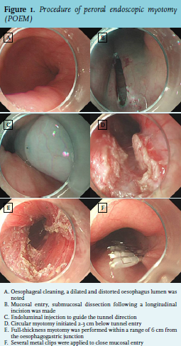 Patients were scheduled for a follow-up visit at 1, 3, 6 and 12 months after POEM and then annually for oesophagogastroduodenoscopy to observe the healing of the wound and check for any signs of reflux oesophagitis. They also underwent barium swallow to measure the oesophageal diameter. Patients were contacted by telephone to assess the occurrence of complications and obtain a current Eckardt score.