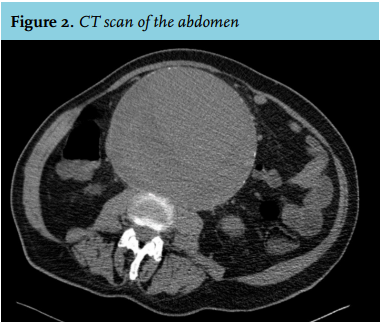 Our suspected diagnosis was confirmed by a CT scan of the abdomen, showing an infrarenal aneurysm of the abdominal aorta (AAA) with a diameter of 17 cm, causing a mechanical ileus (figure 2).