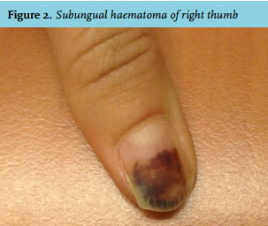 A 23-year-old female patient presented with spontaneous appearance of nail haemorrhages on both hands after a tracking holiday in Peru and Bolivia. At altitudes above 3000 meters, she initially developed painful splinter haemorrhages (figure 1), followed by subungual haematoma (figure 2) and eventually distal onycholysis at all fingernails on both hands (figure 3). Remarkably, her toenails were spared. Her previous medical history included acne conglobata, for which she was recently treated with doxycycline 100 mg once daily for three months by her dermatologist. Other medication included malarone prophylaxis and ethnylestradiol/levonorgestrel. The remaining physical examination and blood analysis were within normal ranges.