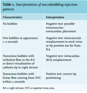 Position was defined as incorrect if there were no or few air bubbles, or a late appearance (> 2 seconds) of bubbles, seen from the superior vena cava entering the right atrium, or if there was turbulent flow in the right atrium or right ventricle.