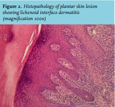 Development of vitiligo or skin eruption in patients receiving anti-PD1 antibody therapy for melanoma is associated with better survival.5 In patients treated with ipilimumab or adoptive T-cell transfer the occurrence of vitiligo has been reported, but not of lichenoid skin eruption. Treatment with topical and systemic corticosteroids resulted in significant improvement. The patient’s melanoma has already been in remission for 17 months.