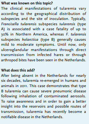 Francisella tularensis is a Gram-negative intracellular coccobacillus causing tularemia, a bacterial zoonotic disease occurring throughout the northern hemisphere. It has been classified as a potential bioterrorism agent due to its highly infectious and virulent properties. Typically, F. tularensis subspecies tularensis (type A) strains are found in North America and can cause severe systemic disease. By contrast, F. tularensis subspecies holartica (type B), which is found throughout the northern hemisphere including in Europe, is associated with mild clinical manifestations.1 In the Netherlands, tularemia re-emerged in 2011.2-4 We report the first case of severe pneumonia caused by F. tularensis subspecies holartica (type B) in an immunocompetent patient in the Netherlands.