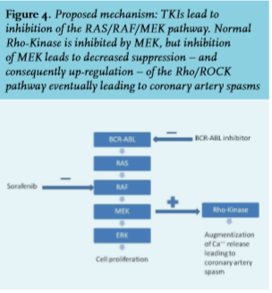 Sorafenib, a TKI to treat renal cell carcinoma and hepatocellular carcinoma is associated with coronary artery spasms. It exerts its cytotoxic effect by inhibition of Raf, but it also inhibits its downstream effectors MEK and ERK regulating cellular proliferation and survival. Coronary artery spasms induced by sorafenib are possibly due to downstream inhibition of MEK which could cause decreased suppression – and, by consequence, the up-regulation – of the Rho/ROCK pathway.17,18 Activation of the Rho/ROCK pathway is shown to have an important role in the pathogenesis of coronary artery spasms due to augmentation of Ca2+ release.15,17 The Rho/ROCK is also important for cell-cell adhesion. Inhibition of normal c-Abl kinases by STI571 (imatinib mesylate) has been shown to activate the Rho/ROCK pathway and influence cell-cell adhesion.19 Inhibition of normal c-Abl has been suggested as a contributing cause of cardiotoxicity by imatinib.20 Inhibition of BCR-ABL1 and normal Abl-kinases with TKIs could lead to down-regulation of the Raf/MEK/ERK and hence to the same break in suppression leading to up-regulation of the Rho/ROCK pathway (figure 4). There are to our knowledge no reports about CAS and other inhibitors of the Raf/MEK/ERK pathway, like trametinib, vemurafenib and dabrafenib.