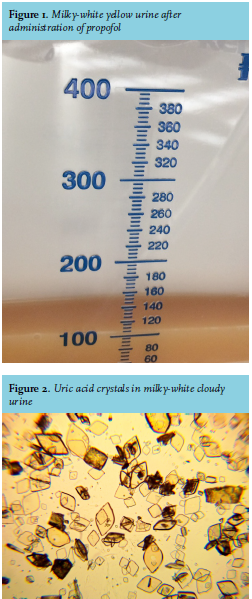 Remarkably a high dose of propofol twice resulted in milky-white urine, whereas a lower dose did not, thus suggesting that the formation of uric acid crystals is a dose-dependent phenomenon. To our knowledge, this observation has not been described before.