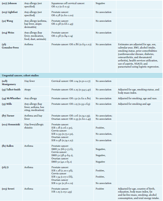 Positive association with urogenital cancers: In total, three studies demonstrated an increased risk of prostate cancer in patients with allergic diseases (range SIR: 1.18-1.64).76,102,105 Only one study showed a positive association between allergic diseases and cervix cancer (SIR 1.34),76 however, only the association between asthma and cancer was studied.