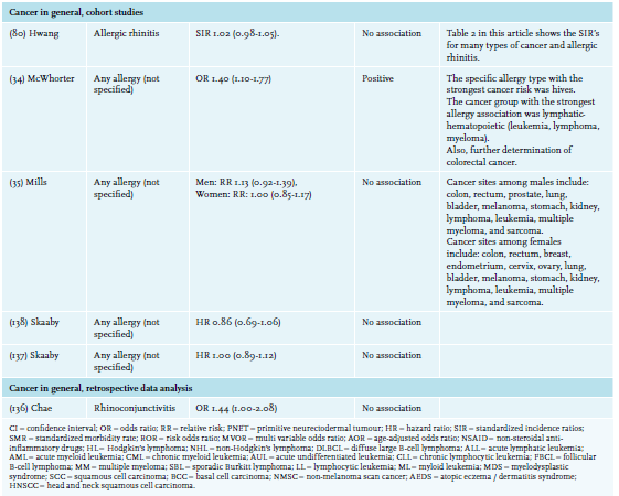 Positive association with cancer: The risk of developing cancer was increased (OR 1.40) in only one study by McWorther.34 In this study, hives were associated with the strongest cancer risk and the strongest allergy association was with lymphatic-hematopoietic cancers.