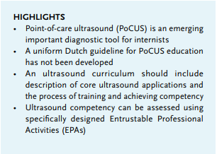 Point-of-care Ultrasound (PoCUS) is defined as ‘diagnostic or procedural guidance ultrasound that is performed by a clinician during a patient encounter to help guide the evaluation and management of the patient’.1 This technique is useful in the primary assessment of acutely ill internal medicine patients and enhances diagnostics and resuscitation as it adds clinical data which cannot be obtained by physical examination.2 This ‘stethoscope of the 21th century’ is quickly developing, is easily accessible with improved portability, produces images of increasing quality, and is more affordable; however, the diagnostic performance is largely operator-dependent and it is not known how many PoCUS exams a sonographer needs to perform to obtain reliable results.3 Medical treatment decisions can be guided by ultrasound results; therefore, it is essential that these results are trustworthy. In the Netherlands, ultrasound was first advocated in 2012 as a useful complementary skill for internists in the management of acutely medically ill patients.4 Today, mandatory PoCUS training is included in the education of internists as stated by the Dutch internal medicine federation (Nederlands Internisten Vereniging, NIV) and a national training program that is currently under development.5 However, there are not enough ultrasound experts to provide education to all internal medicine residents, and it is questionable if every internist should be fully competent for every PoCUS indication. Regardless, proper training is critical for both current and future ultrasound applications within internal medicine.