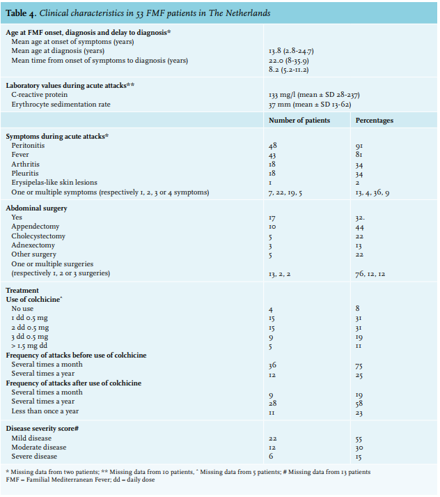 Clinical symptoms of Dutch FMF patients demonstrate a similar pattern as described in other Mediterranean and non-Mediterranean studies. Peritonitis (63-95%) and fever (78%-100%) are the most frequently described symptoms during acute attacks.9-11,13,15,17,19 While pleuritis was more frequently seen in non-Mediterranean studies compared to Mediterranean studies (49% vs 40%), arthritis and erysipelas-like skin lesions were more frequently seen in Mediterranean studies compared to non-Mediterranean studies (52% vs 32% and 22% vs 18%). Simliar to other studies, appendectomy and cholecystectomy were the most frequently performed abdominal operations (35% and 11% in Arabs patients and 19% and 2% in Turkish patients, compared to 44% and 23% in our study).11,13