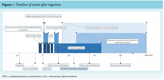 Despite the therapy mentioned above and the start of vasopressors, circulation remained unstable and the patient experienced a total of three cardiac arrest episodes in the hospital due to pulseless electrical activity. As further alkalinisation would aggravate an already very severe hypokalaemia (1.5 mmol/l; reference: 3.5-5 mmol/l), we decided to repeat the full dose of lipid emulsion intravenously as a last possible resort (cumulative dose of 15 ml/kg). Shortly thereafter, haemodynamic parameters and cardiac contractility improved. Toxicological analysis showed a high level of chloroquine (16.1 mg/l three hours after ingestion; reference for toxic level: > 0.5 mg/l) and a positive blood test for benzodiazepines. High-dose diazepam was added, resulting in further improvement of cardiac contractility and the possibility to cease vasopressor agents. Alkalinisation was restarted as soon as potassium stabilised with supplementation; active charcoal was administered repeatedly (total dose of 150 g). After 60 hours, cardiac conduction normalised and therapy with sodium bicarbonate and diazepam was discontinued. Figure 1 shows the timeline of events after ingestion of the overdose of chloroquine. On day seven, the patient was extubated. She made a full recovery from the post-anoxic and toxic encephalopathy.
