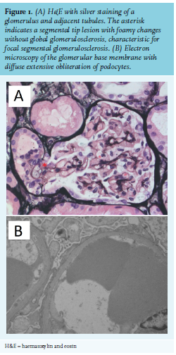 Although it is not possible to prove a causal link between polyautoimmunity and a FSGS tip lesion with certainty in our patient, both disease entities involve dysregulation of the immune system. The exact cause of FSGS remains unclear, but is thought to involve a glomerular permeability factor. This factor would affect the glomerular capillary wall and thereby lead to podocyte fusion and proteinuria. Additionally, since the monoclonal antibody rituximab agent (that depletes the CD20 B-cell population) appears effective as a corticoidsparing agent in glucocorticoid-sensitive FSGS, B-cells may play a role in the pathophysiology.9 Similarly, in nearly all autoimmune diseases, dysfunctional T-cells play a key role: CD4-positive T-lymphocytes lose immunological tolerance to self-antigens and B-cells produce a spectrum of more or less specific auto-antibodies. Ciclosporin, which mainly inhibits T-cells, has also been successful in treating FSGS in Sjögren’s syndrome in a few cases.4,6 Interestingly, diffuse epithelial foot process effacement has also been described in systemic lupus erythematosus (SLE) without immune complex deposition, occurring more commonly with a disease flare.10 One may speculate that activated T-cells are implicated in the pathogenesis of this so called ‘lupus podocytopathy’.